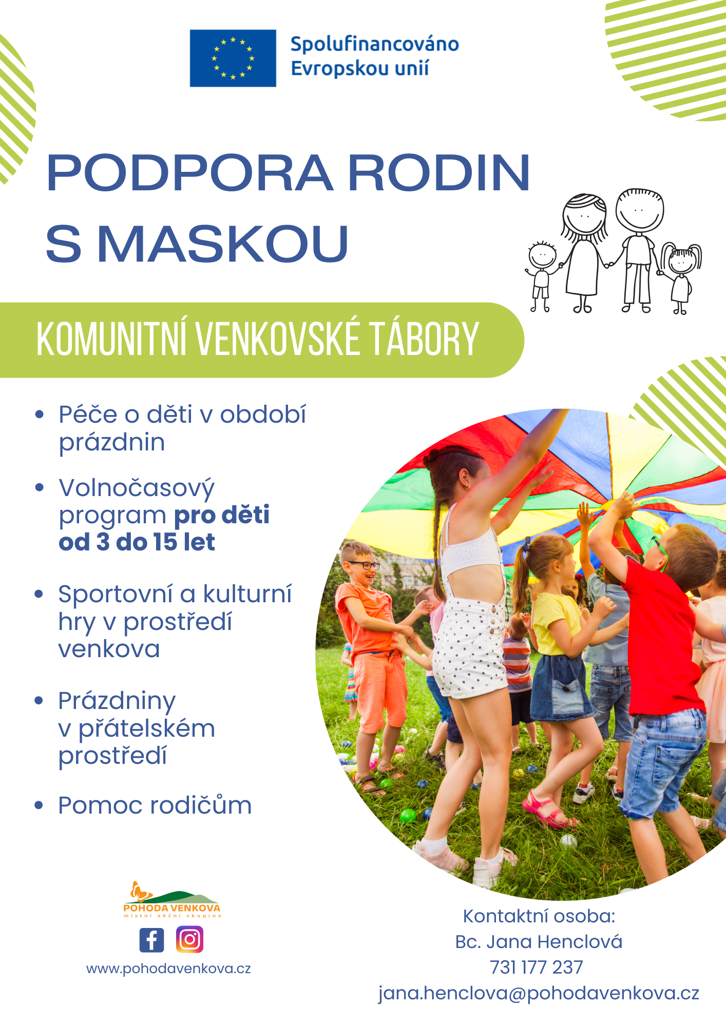 V rámci aktivity zaměřené na realizaci komunitních venkovských táborů bude po dobu 36 měsíců realizováno celkem 48 turnusů komunitních venkovských táborů na více místech v území, s cílem podpořit a rozvíjet přirozené vazby v komunitě. Komunitní venkovské tábory budou určeny pro děti od 3 do 15 let věku včetně. Komunitní venkovské tábory budou realizovány zejména v době školních prázdnin (letní a jarní prázdniny apod.). Program bude zajištěn pro dopolední i odpolední část během pracovních dnů v době od 7 do 16 hodin. Komunitní tábory budou zaměřeny na sportovní a kulturní hry, na život v přírodě. Program bude připraven úměrně věku přihlášených dětí. Cílem bude vytvářet u dětí pozitivní vztah ke sportu, kultuře, přírodě, historii a tradicím svého bydliště. Rozvíjeny budou přirozené vazby v komunitě.